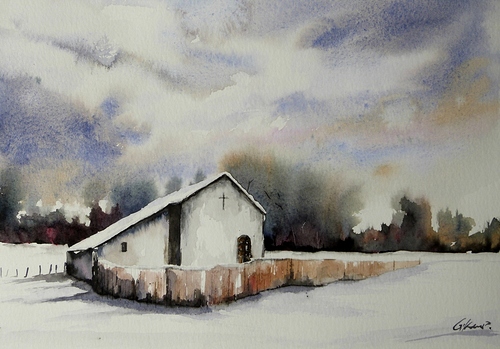 Old Church in Snow, A4 watercolour. This based on a photo of the Church situated in Snowdonia, Wales.