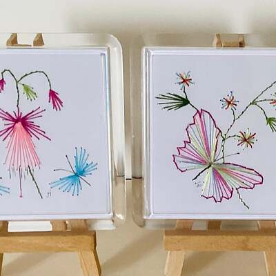 Showing a pair of snap clip acrylic coasters, containing hand embroidered butterflies and flowers. I used art card to do the embroidery. They measure 9cm square They are wipe clean coasters, or you can use them for display Handy little gift for...
