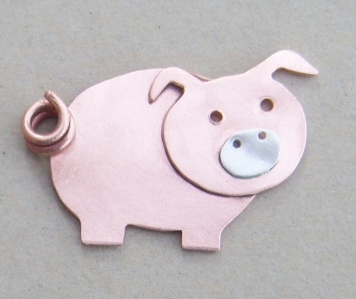 Another of my pig collection. This brooch is copper, approximately 38mm from tip of the ear to the end of the curly tail; the snout and the fastener are sterling silver.