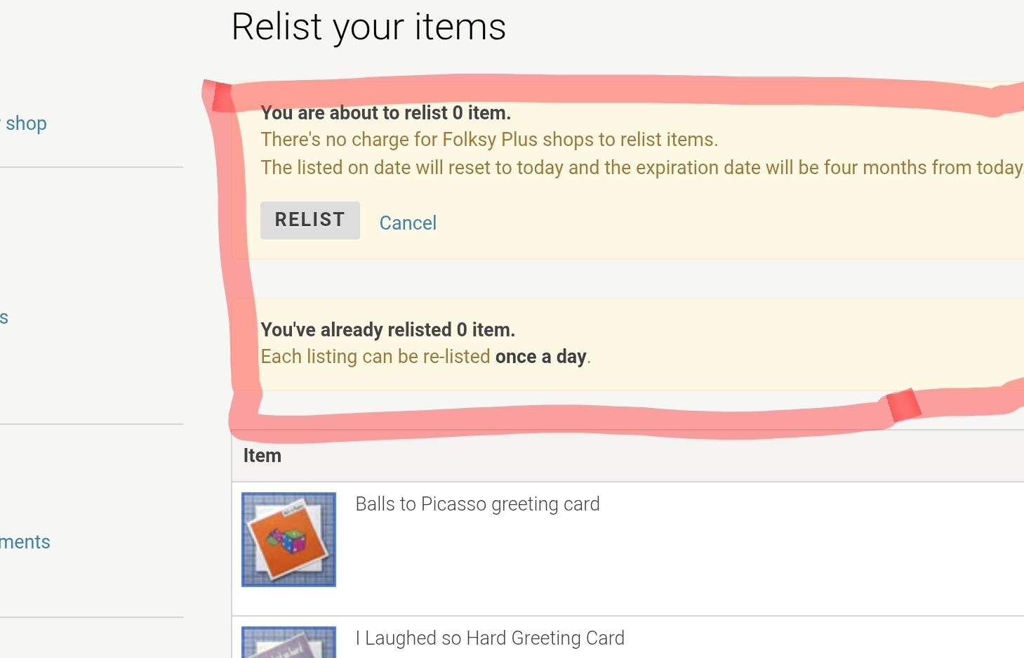 Well that seems to be the case, if the system throws up an error page , you would think that whatever you were attempting to do did not work, but it looks like it did relist the first 40 item but still say “something has gone belly up” – “try doing what you were doing again” this seems to be an ongoing issue with this site.